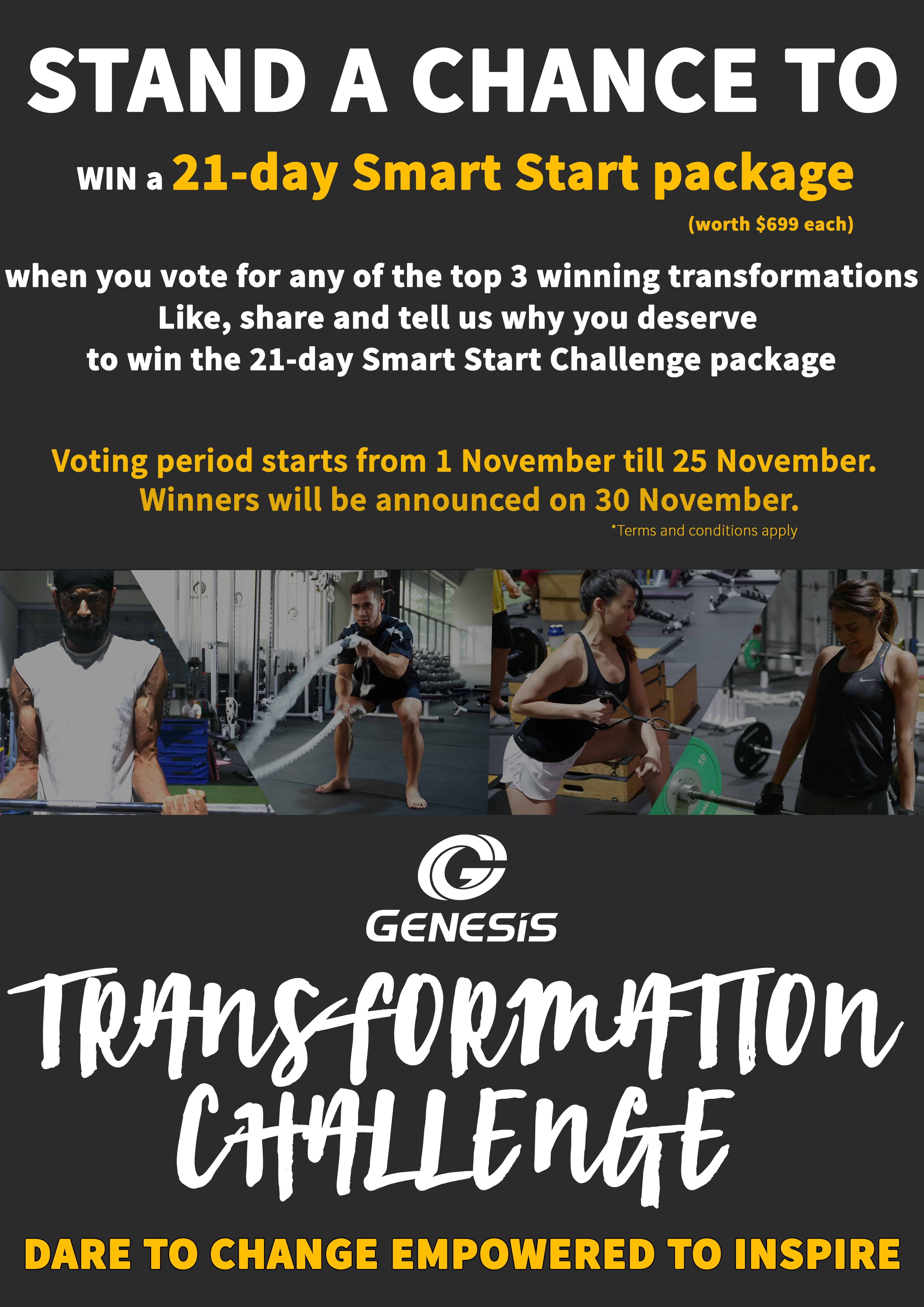 Vote for the top 3 transformations at www.facebook.com/GenesisGymSingapore/ to qualify for the lucky draw and stand a chance to win a 21-days Smart Start Package (worth $699). 3 packages will be given away and the winners of the lucky draw will be announced on the 30th November 2017. Remember to like and follow our Facebook page so that you won’t miss out on this wonderful opportunity to encourage your family member/friend who is participating in this transformation campaign and also stand a chance to win something for yourself! Voting will begin on 1st November so stay tuned to hear our participant’s inspiring stories.