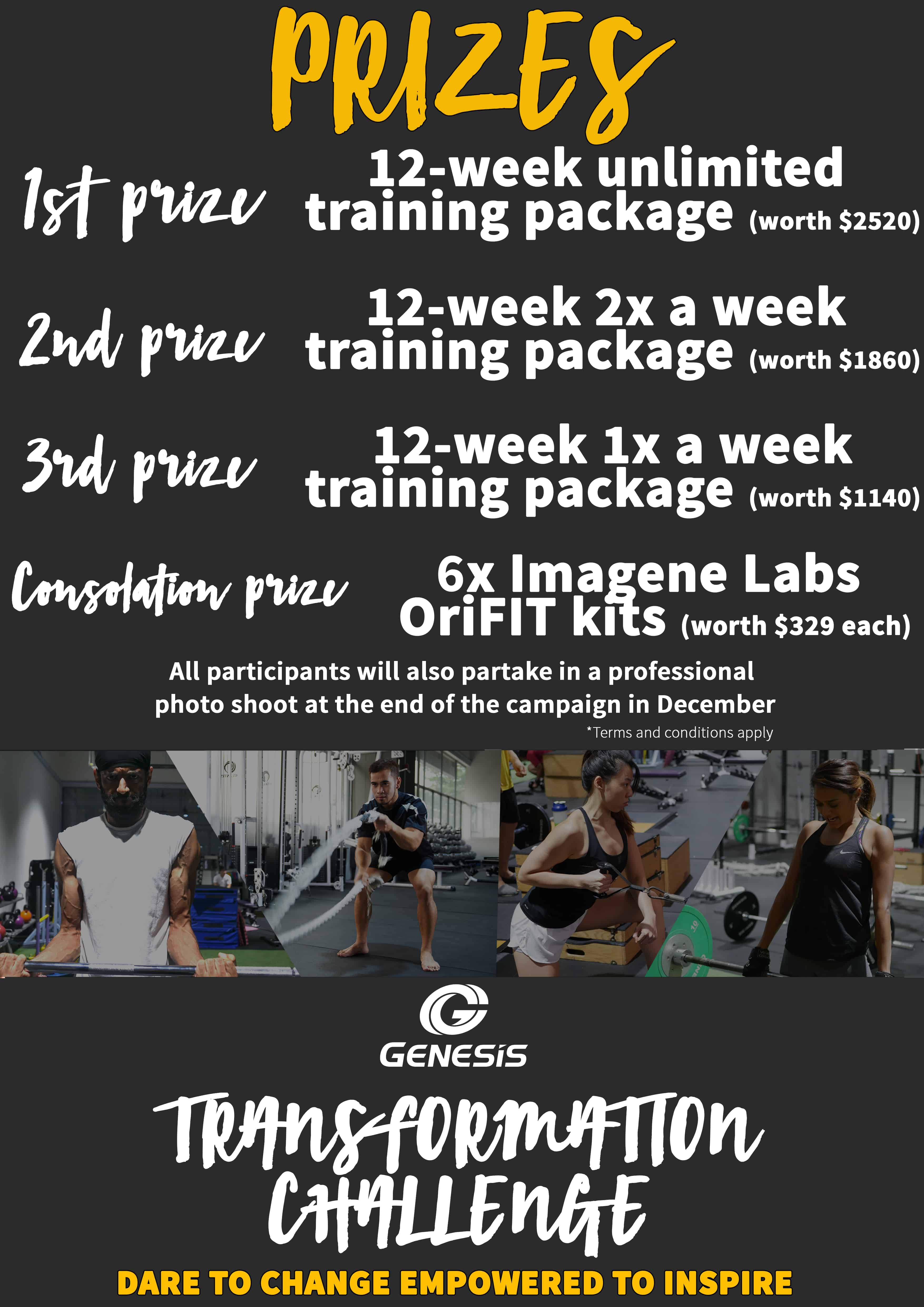 Each participant’s dedicated post will be fully publicized by 1 November 2017 on the Genesis Gym Facebook page. We encourage you to share your testimonial video and your transformation story blog post from our page to your personal Facebook page to encourage your friends and family to vote. And we will only consider votes on our post into the final result. There will not be specific judging criteria, as we believe that every participant has a different story. Hence, the voting is strictly up to the public to decide. The voting will end on 25th November and winners will be announced on the 29th November.